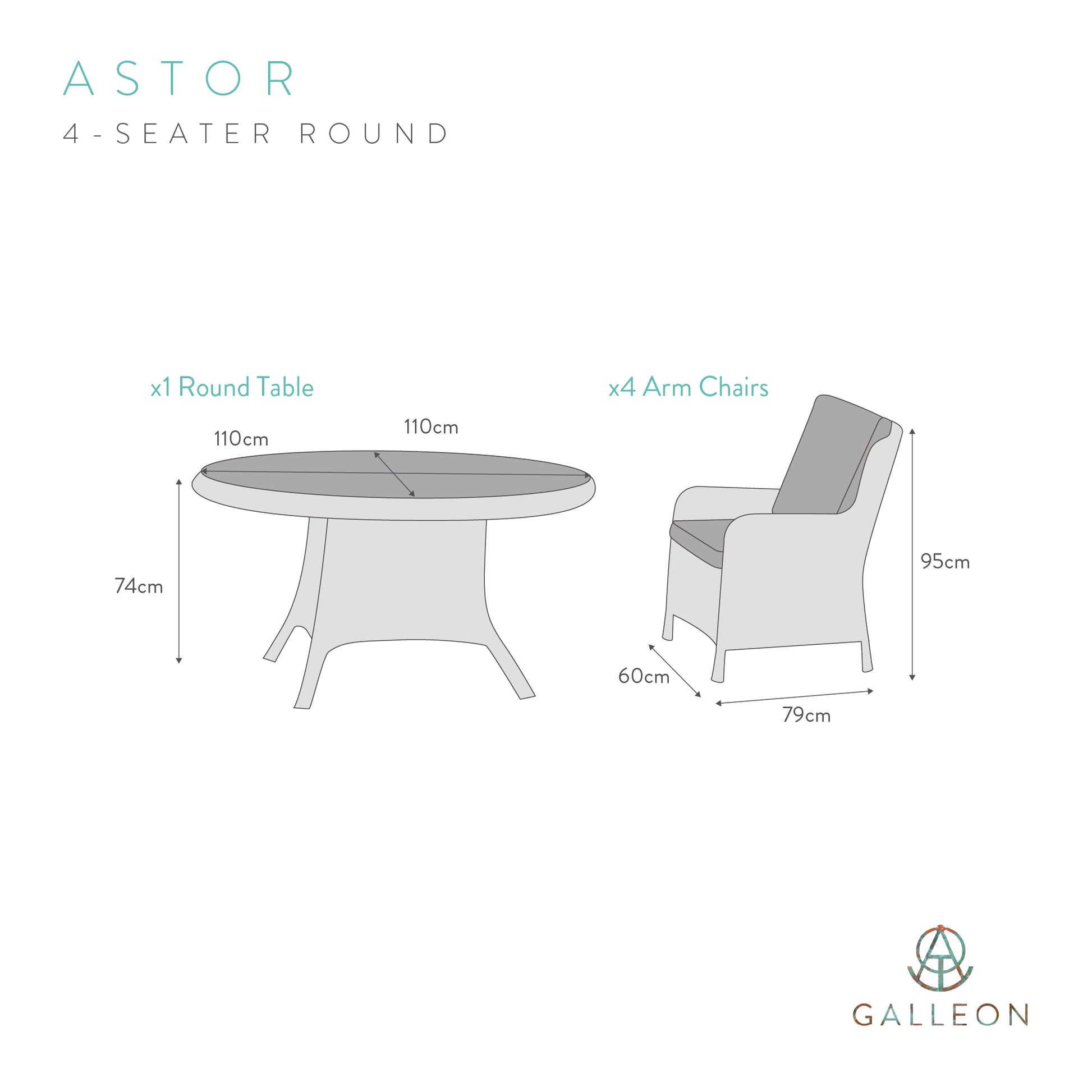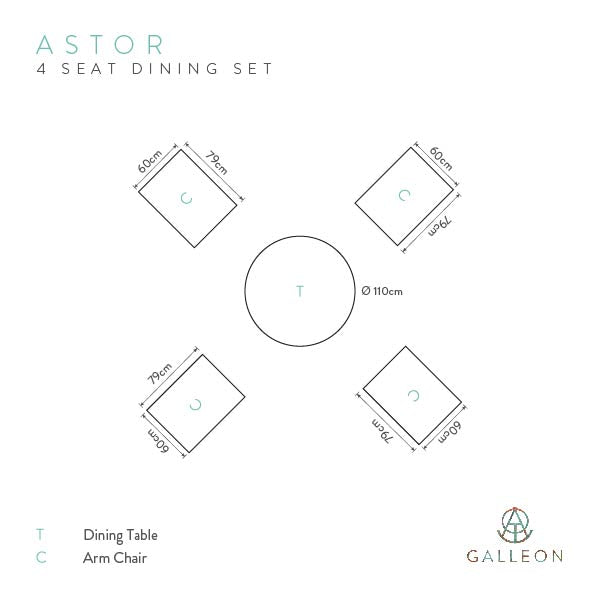 This set comes with four Astor Outdoor Armchairs, offering versatility and durability to perfectly suit your alfresco dining needs.