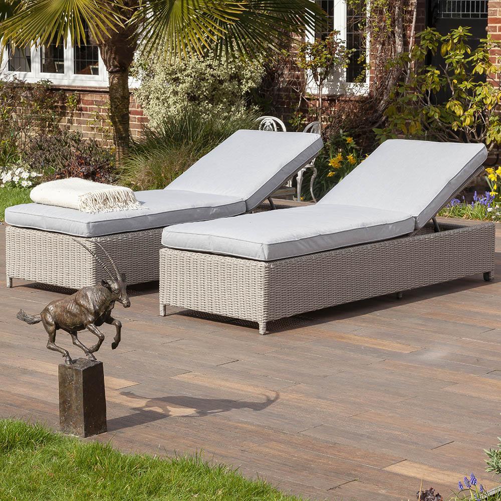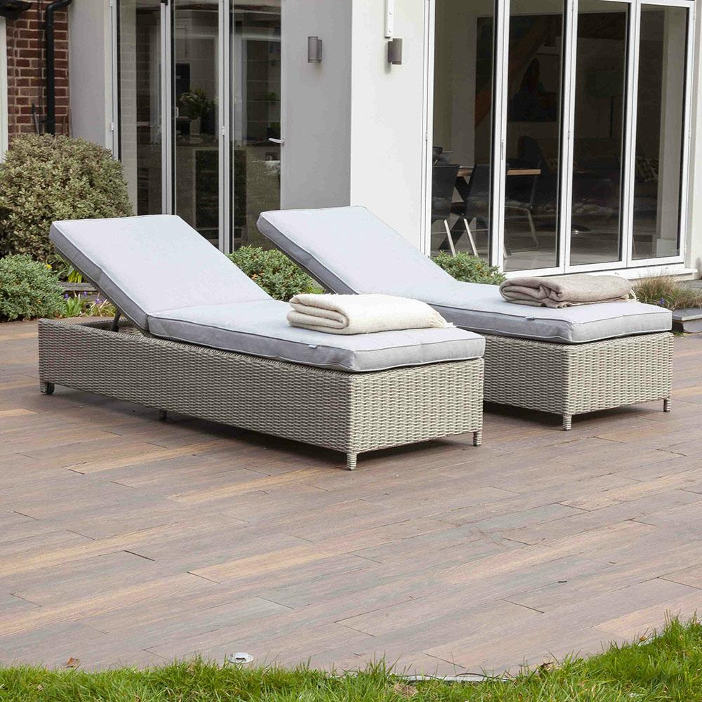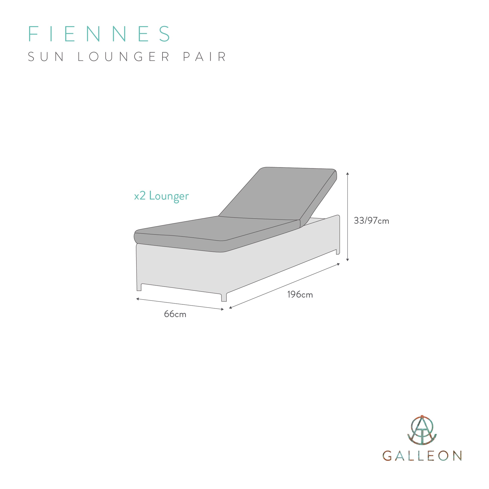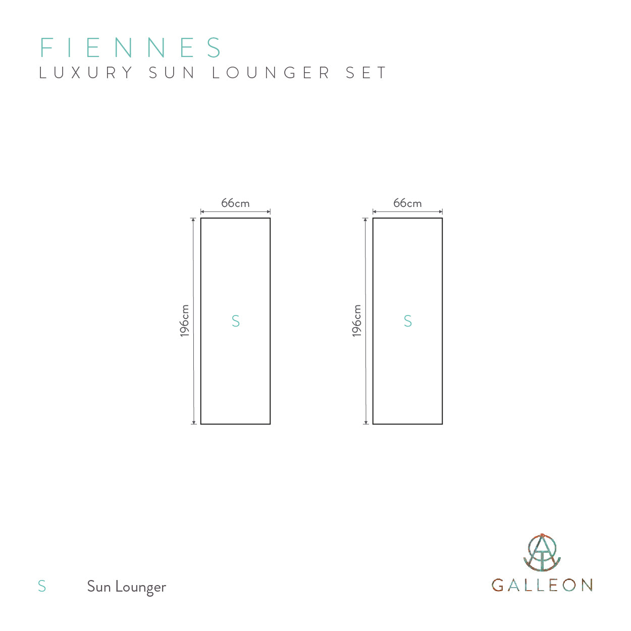 Created with peace and tranquillity in mind, sustainable rattan garden furniture by Galleon is guaranteed to be a beautiful addition to your outdoor space. Enjoy the sun and relax in our Fiennes Luxury Sun Lounger Set, with a beautiful pair of light grey sun loungers. The bespoke natural rattan weave wicker combines perfectly with the light blue-grey soft cushions to make the Fiennes Luxury Sun Lounger Set the ultimate calming garden experience.