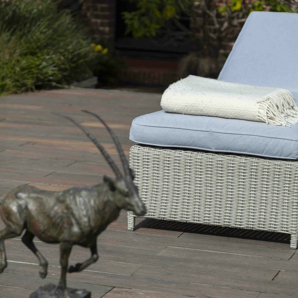 - Light grey luxury rattan weave with blue-grey cushions (throw not included)