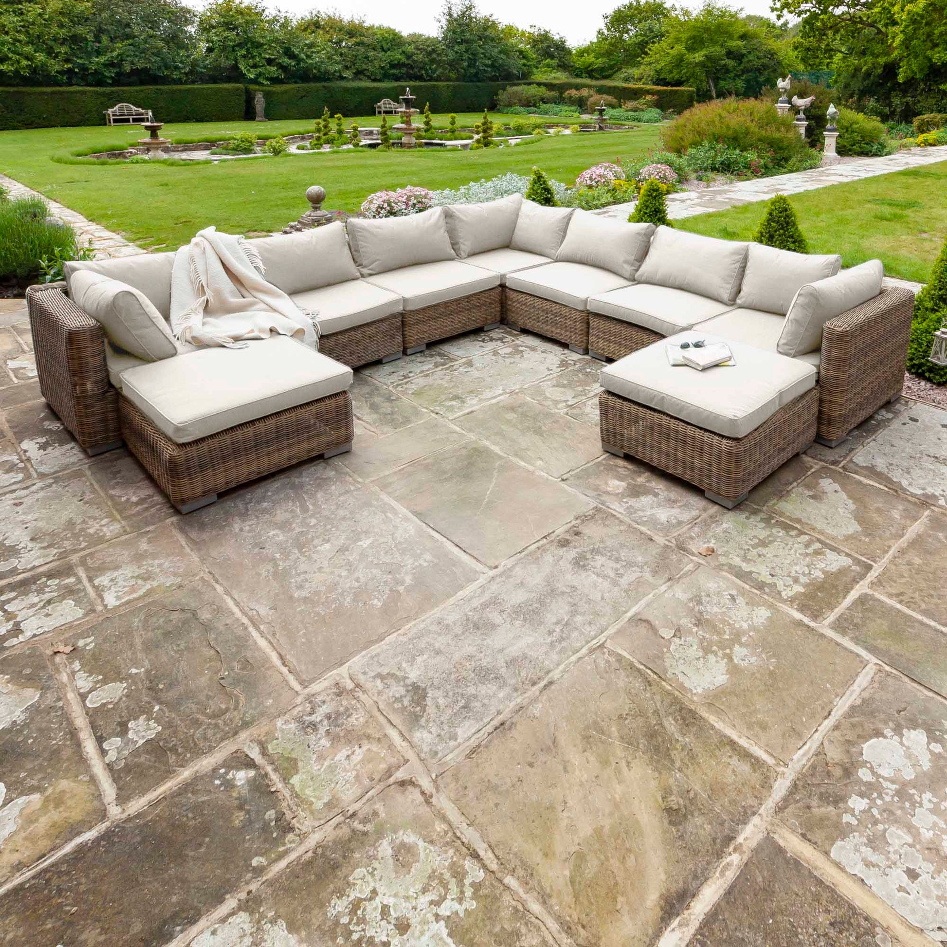 Choose the perfect sofa set for your outdoor space with the flexible modular Livingstone corner brown and grey rattan garden furniture set, offering versatile, high-quality and long-lasting performance.